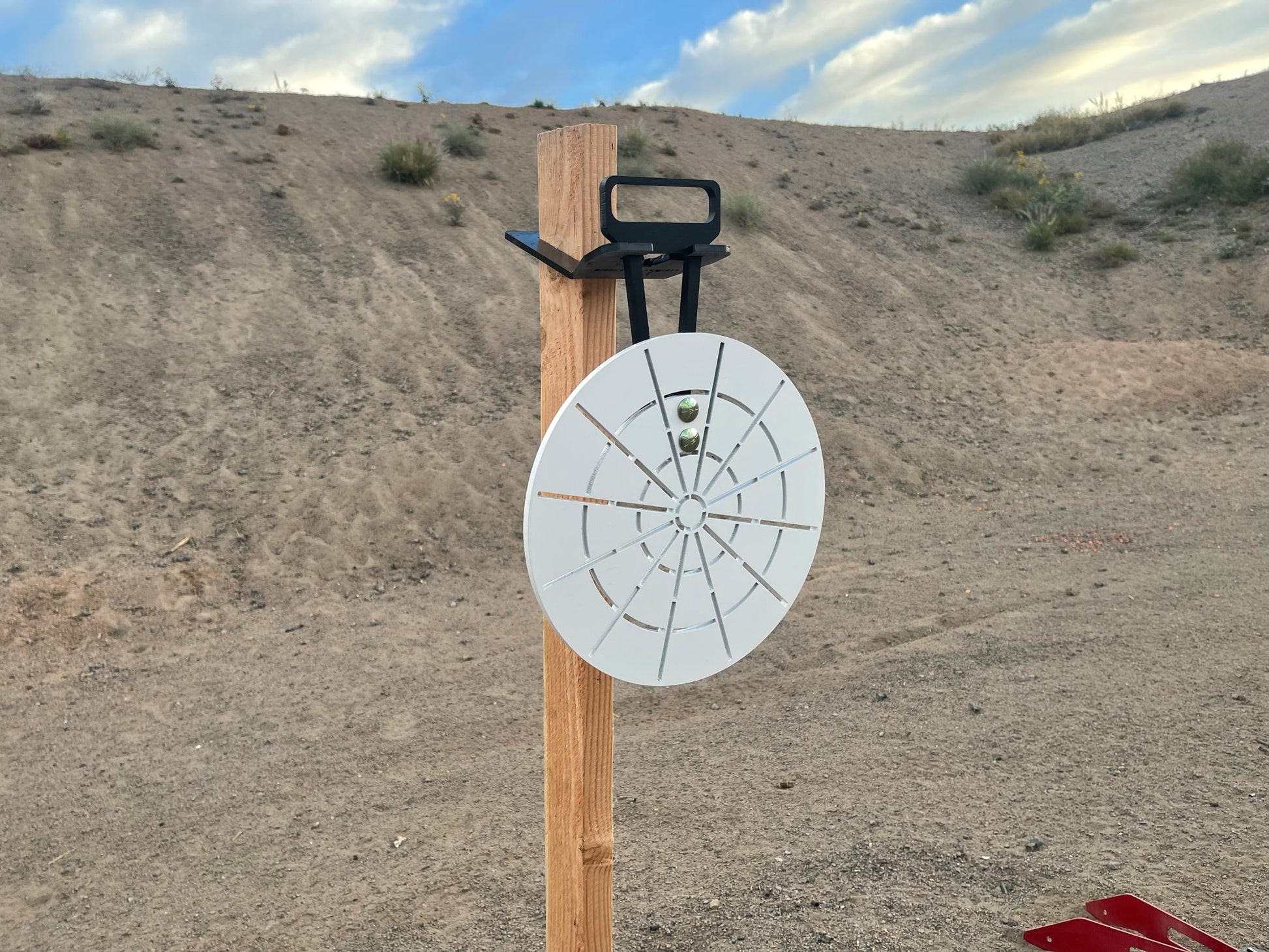 The Direct Hit Targets 12" round Accuracy hanging target works with all of our hangers and can be installed in any position of the multiple position hangers.